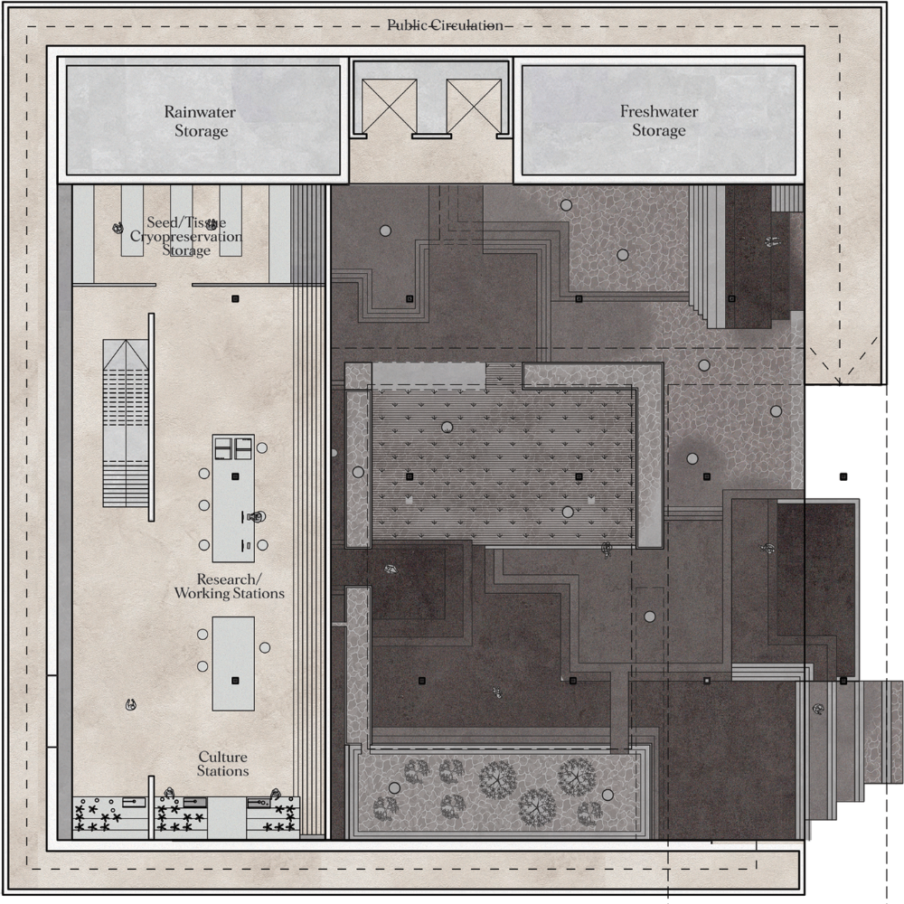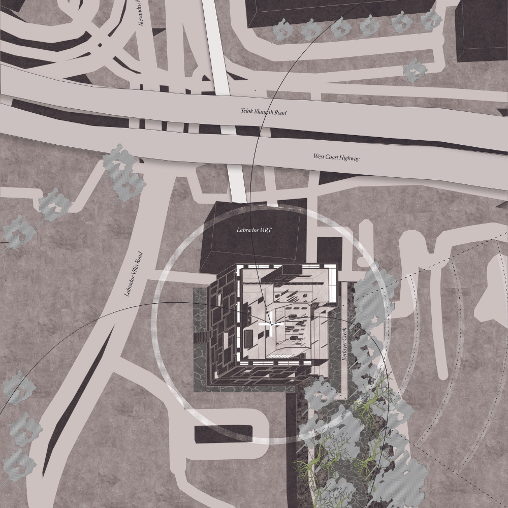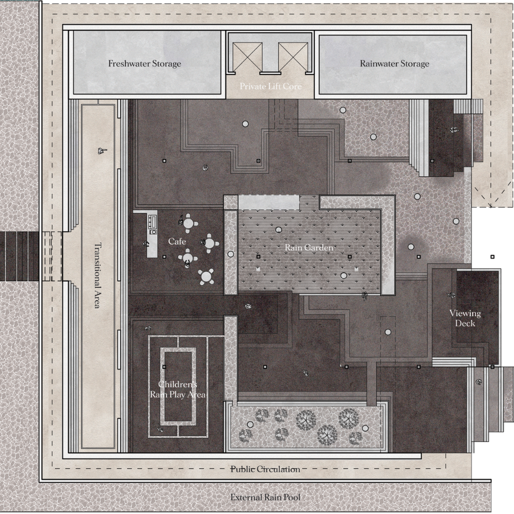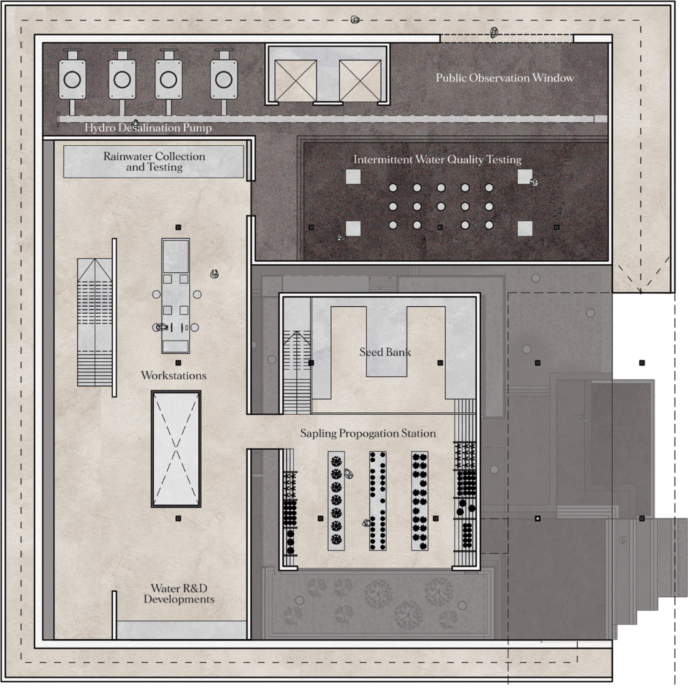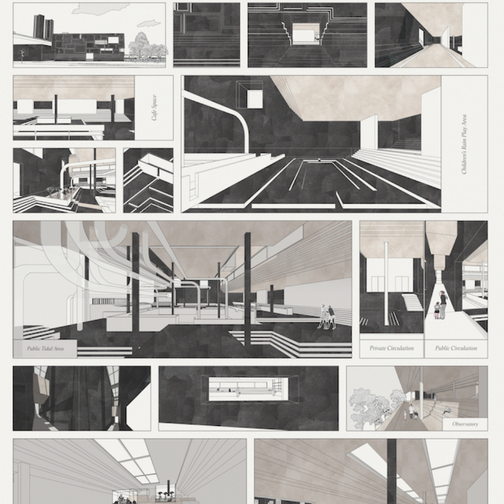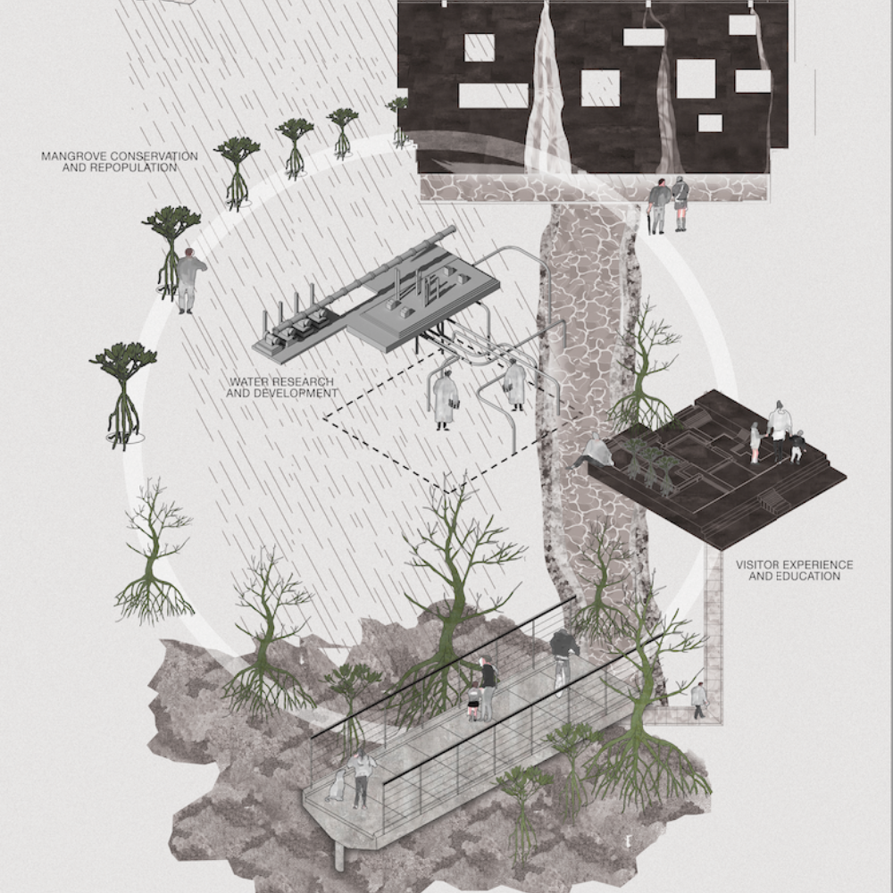 The design amplifies the experiential qualities of water as an element and representing this natural system in a highly curated urbanised diorama. Through the symbiotic relations with water and nature, the centre becomes a crucial starting point for future water developments and nature repopulation, aided by active public participation.