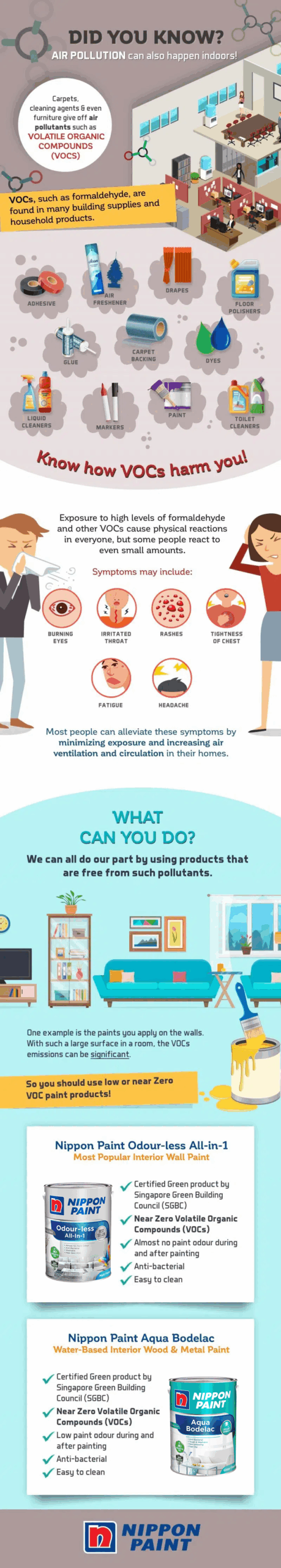 Did you know that air pollution can also happen indoors? Carpets, cleaning agents, furniture & even the paint you use give off air pollutants such as volatile organic compounds (VOCs)! They can cause physical reactions to your body in many ways, and you can reduce your exposure to them by opting for paint such as Nippon Paint Odour-less All-in-1 and Nippon Paint Aqua Bodelac which contain near zero volatile organic compounds.