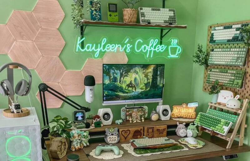 Adopting a green colour palette for your gaming room is a good way to create a peaceful and calming atmosphere. Mint green, in particular, is refreshing and invigorating, fostering an environment that keeps you engaged in long gaming sessions.